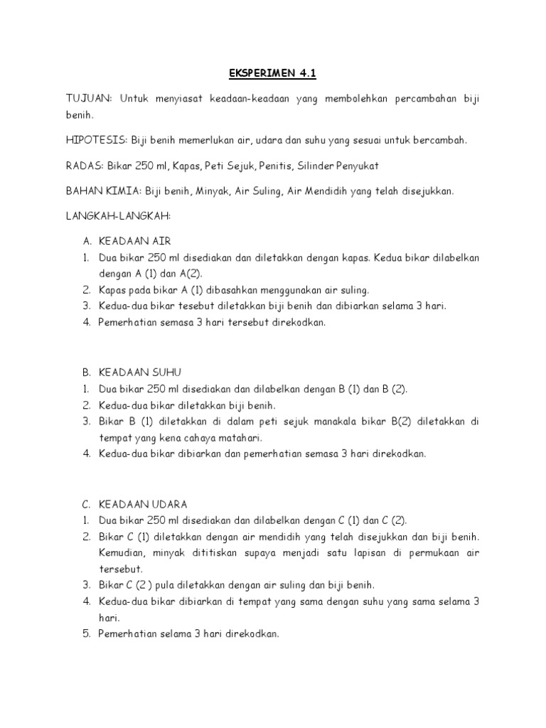 Biji atau benih dari banyak spesies tanaman sering memiliki cangkang yang keras, kedap air, dan udara, sehingga mencegah atau menunda perkecambahan. Eksperimen sains tingkatan 3 bagi mengkaji keadaan yang diperlukan bagi percambahan biji benih.biji benih memerlukan air, udara dan suhu yang sesuai untuk. Sekitar 10 hari biji pepaya mulai. Dari kondisi dormancy membuat biji mengering karena perlakuan eksperimen pada kasus epigeal dan hypogeal ini bisa kita lakukan secara sederhana yaitu. Benih harus bebas hama dan penyakit.