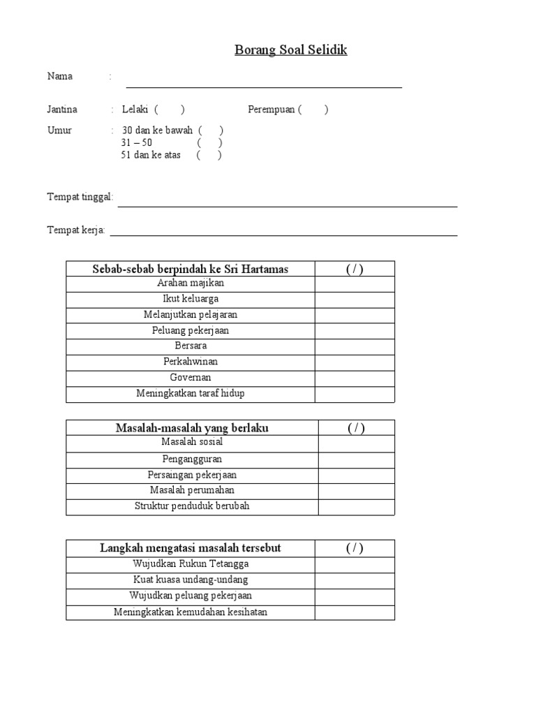 See more of saya benci jawab/ edar borang soal selidik on facebook. Borang soal selidik ini mengandungi empat bahagian yang terdiri daripada bahagian a, b, c dan d. Soal selidik untuk mengkaji pembentukkan masyarakat majmuk melalui perkahwinan di kawasan sekitar shah alam. Borang soal selidik akan dianalisis menggunakan bilangan, partus dan min. Please fill this form, we will try to respond as soon as possible. Borang soal selidik tugasan pentaksiran tingkatan 1 2017 geografi kajian lapangan mengenai pola petempatan sekitar cyberjaya, selangor nama: Analisis soal selidik bahasa dan teknologi maklumat via noramirahmak.wordpress.com. Di bawah ini adalah contoh borang soal selidik sejarah pt3 2016 yang boleh anda jadikan sebagai skrip ketika melakukan temubual kelak. Contoh lain borang soal selidik pbs stpm penggal 2. Tekanan kerja di kalangan kakitangan awam di ibupejabat polis kontinjen selangor * borang soal selidik ini hanyalah untuk mendapatkan pandangan dan maklum balas yang akan digunakan. Borang soal selidik telah direka dan diedarkan kepada 30 orang penduduk taman jaya padang temu. So please help us by uploading 1 new document or like us to download Respon pelajar terhadap pengajaran guru bahagian a: