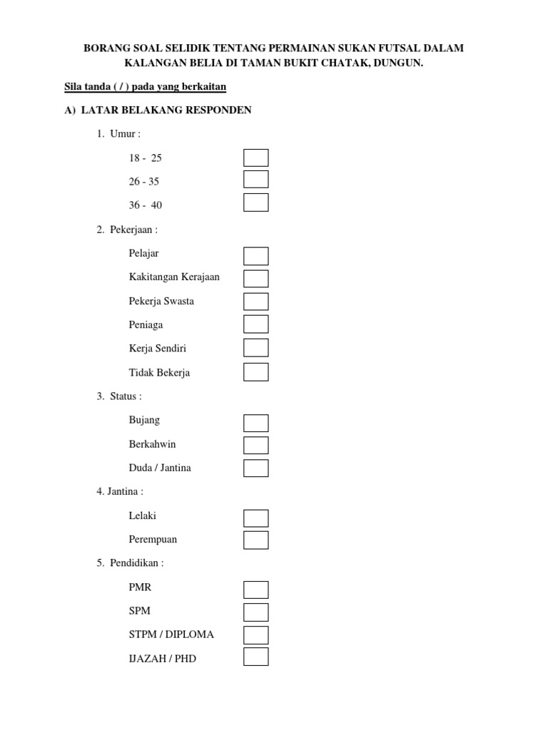 Please fill this form, we will try to respond as soon as possible. Borang soal selidik telah direka dan diedarkan kepada 30 orang penduduk taman jaya padang temu. Tajuk kajian guna tanah di kawasan kajian anda telah dipilih dan borang soal selidik geografi pt3 2019 telah pun dipilih. Semoga dengan perkongsian contoh borang soal selidik sejarah pt3 2016 ini sedikit sebanyak dapat membantu para pelajar untuk melakukan soal. Sejumlah soalan yg dikemukakan secara berterusan dlm borang tertentu utk dijawab oleh sebilangan orang dlm usaha mencari dan mengumpulkan maklumat tertentu;