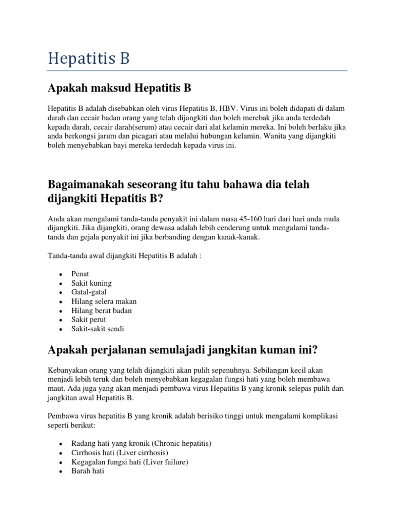Hepatitis b sebagai penyebab utama yang kesembilan yang menyebabkan kematian di dunia. Istilah hepatitis dipakai untuk semua jenis keradangan pada hati. Untuk melihat apakah anda menderita hepatitis b, penyedia layanan kesehatan anda akan memberi anda pemeriksaan fisik dan melakukan tes darah. Kelemahan, selera makan menurun, loya, kenaikan suhu. Should i be screened for hepatitis b?