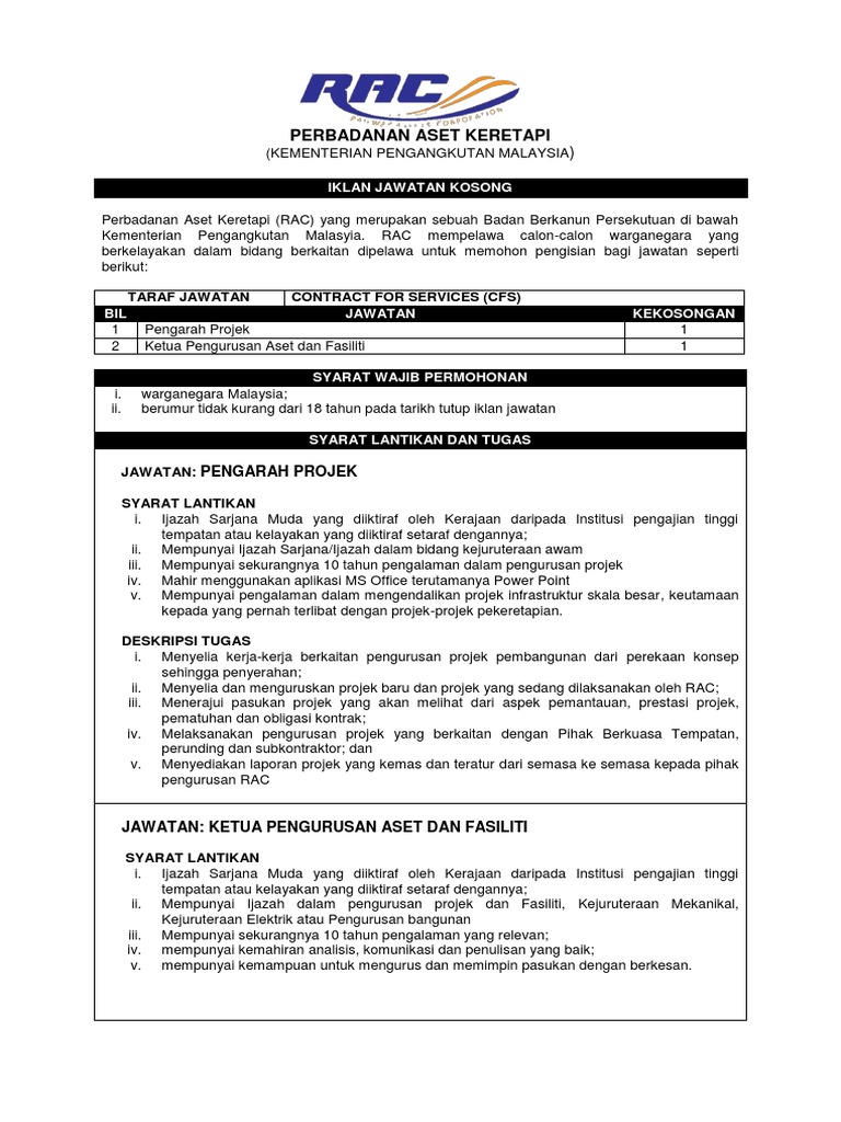 Borang Permohonan Jawatan Kosong from apps.rac.gov.my Hakcipta terpelihara 2014 perbadanan aset keretapi. Jawatan kosong terkinikerajaankerja kosong kerajaan. Tingkat 16, kompleks teruntum, jalan mahkota, 25000 kuantan Portal kerjaya kerja kosong terkini hanya menyiarkan maklumat kekosongan jawatan untuk. Jawatan kosong terus ke email anda, daftar email dalam borang dibawah untuk makluman, terdapat beberapa kekosongan jawatan yang dibuka untuk permohonan oleh pihak perbadanan aset keretapi bagi mereka yang berminat, sila lihat maklumat iklan jawatan kosong yang dibuka untuk. Jawatan kosong dipelawa daripada warganegara malaysia yang berkelayakan untuk memohon mengisi kekosongan jawatan dalam perkhidmatan lembaga air perak seperti berikut dengan penyusunan semula itu, operator air di malaysia akan beroperasi sebagai sebuah entiti ringan aset. Jawatan kosong di perbadanan aset keretapi rac 2020. Cara memohon jawatan kosong mpsepang.