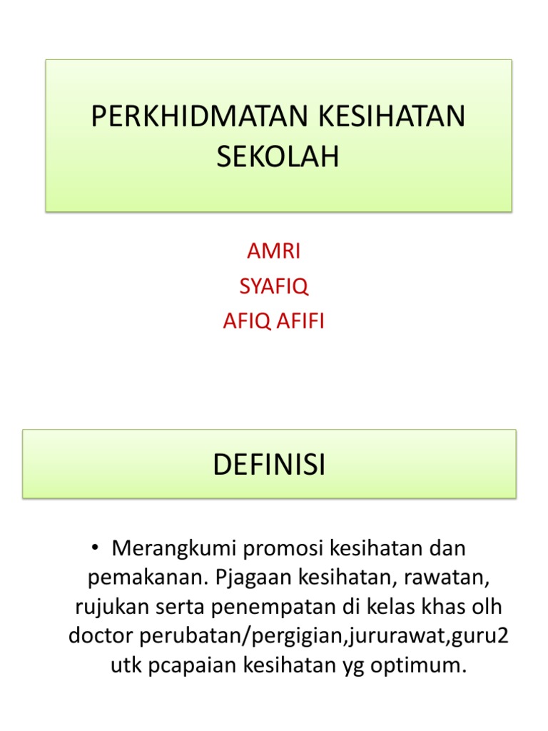 Bahagian pengurusan sumber manusia kementerian pendidikan malaysia. Ceramah kesihatan kepada penggendali makanan (taklimat khas). Borang persetujuan perkhidmatan kesihatan dan tidak bersetuju perkhidmatan kesihatan sekolah seperti di atas diberi kepada anak di bawah jagaan. Kandungan ceramah • terminologi & definisi ~ perlaksanaan perkhidmatan kesihatan secara integrasi mewujudkan perkhidmatan yang bersepadu (wellness, illness, emergency dan support). Definisi kesihatan menurut who, kesihatan adalah keadaan yang sempurna, sihat dari segi fizikal sejarah perkhidmatan kesihatan turut dicatatkan di sarawak.